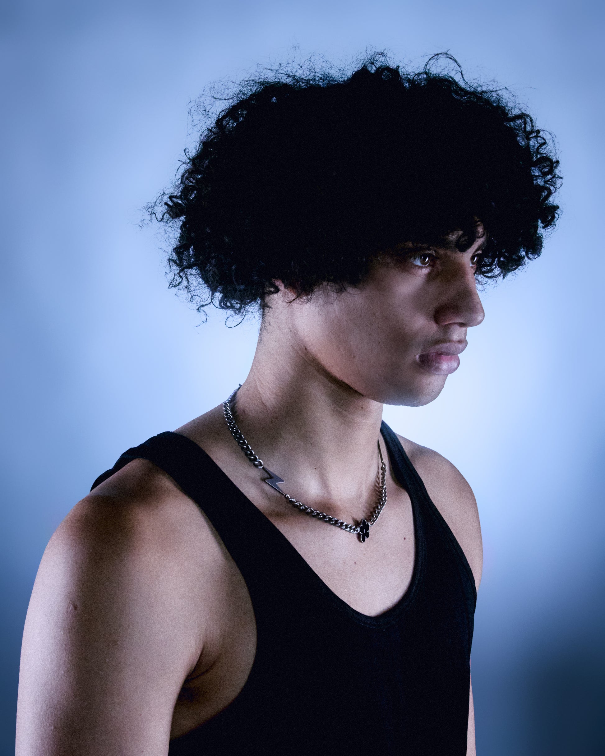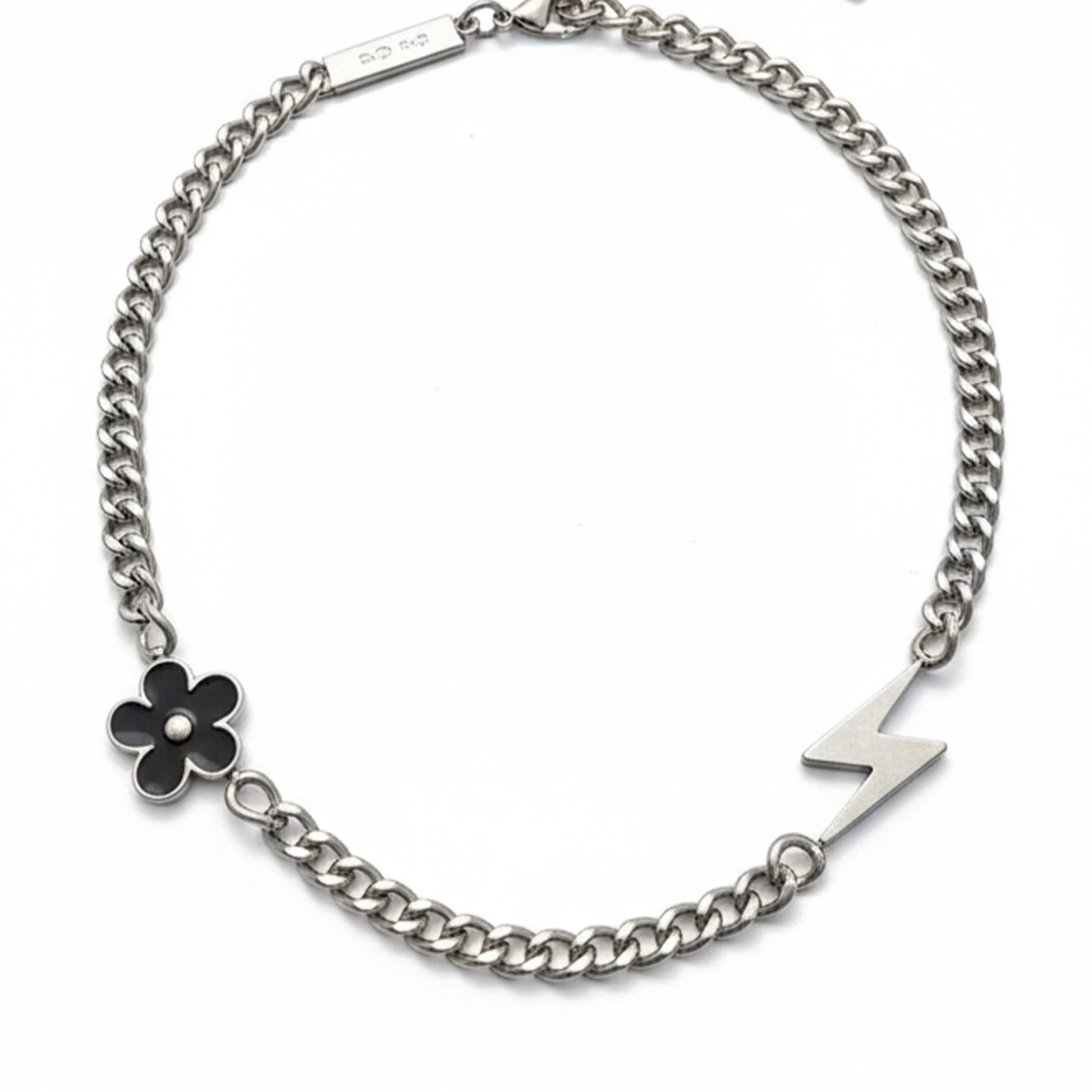 Nuestra cadena combina estilo urbano y minimalismo en un solo diseño. Fabricada en acero de alta calidad, cuenta con eslabones gruesos y resistentes, decorados con dos dijes únicos: un rayo metálico de acabado pulido que transmite fuerza y energía, y una flor negra esmaltada que aporta contraste y un toque distintivo.