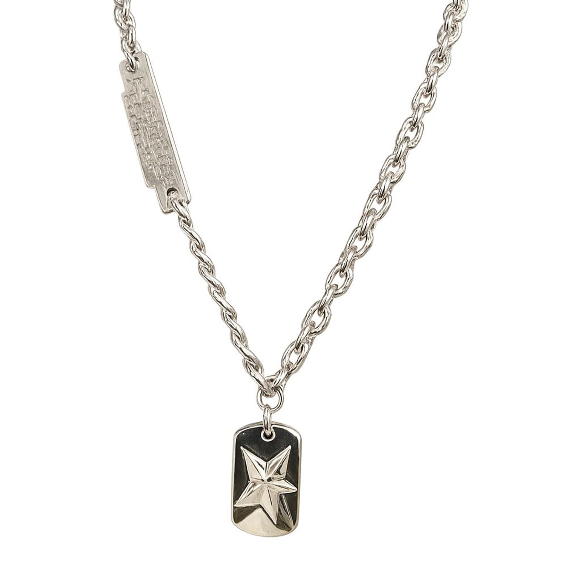 El Star Tag Necklace es una pieza que combina la rudeza del estilo militar con un detalle estético moderno. Su diseño incluye una cadena de eslabones robustos en acero inoxidable y una placa tipo dog tag grabada con una estrella en relieve, símbolo de fuerza y distinción. Ideal para quienes buscan un accesorio con carácter, resistente y con un estilo que no pasa desapercibido.